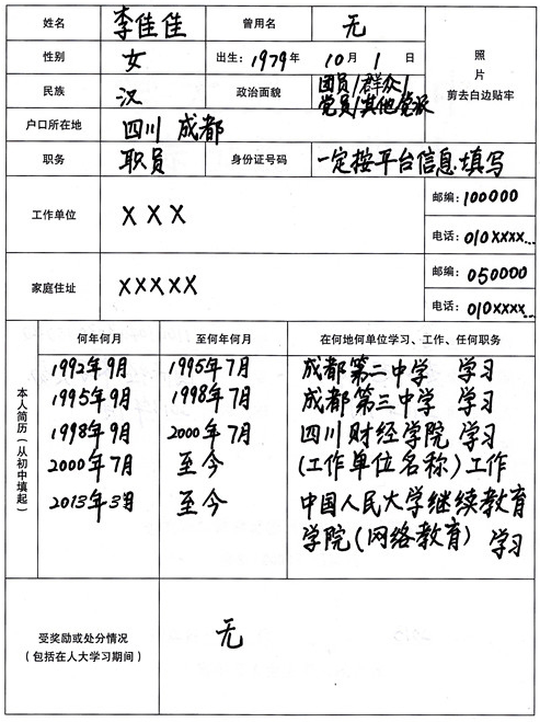 4、個(gè)人簡(jiǎn)歷:從初中開(kāi)始寫(xiě)起。一定要順序填寫(xiě),不得倒序。